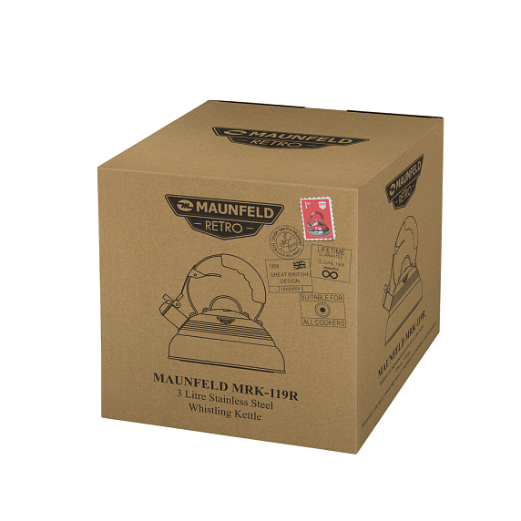 Maunfeld MRK-119R — это металлический чайник со свистком из коллекции «Retro». Подходит для использования на любых варочных поверхностях. Материал корпуса —нержавеющая сталь и алюминий, материал свистка — сплав цинка. Ручка также выполнена из металла (нержавеющей стали) и имеет накладку из термостойкого пластика.