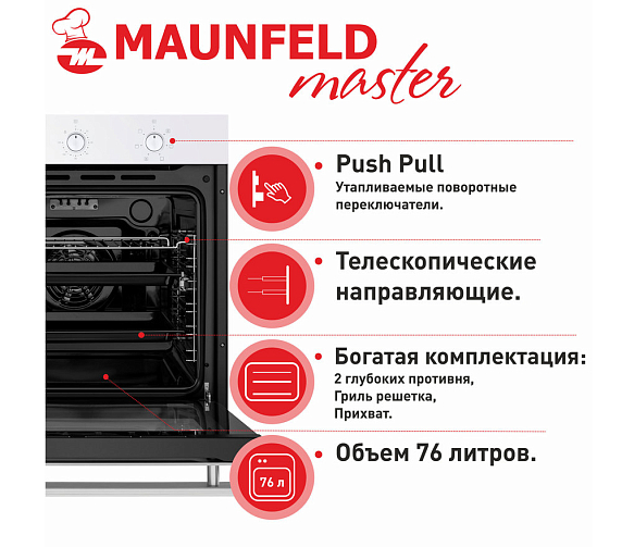 Духовой шкаф Maunfeld EOEF.766W из коллекции Master — это новое слово в кухонной бытовой технике. При стандартных размерах объем камеры увеличился до 76 л, это позволяет готовить блюда сразу на нескольких уровнях, экономя время. В комплектацию входят телескопические направляющие. Управление осуществляется при помощи утапливаемых ручек PUSH PULL, а за настройку таймера отвечают сенсорные кнопки. Дверца духового шкафа из тройного стекла и тангенциальное охлаждение создают холодный фронт и делает процесс приготовления безопасным.