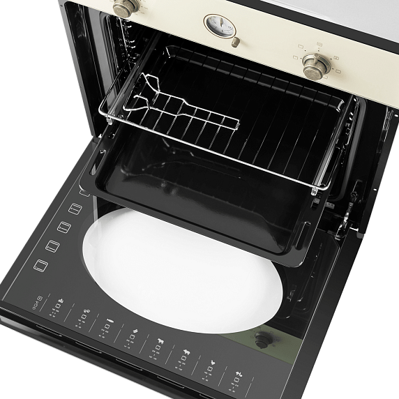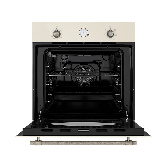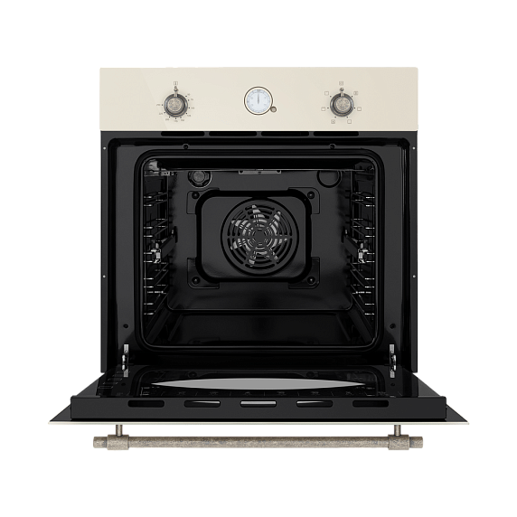 Духовой шкаф располагает шестью разнообразными программами, дающими возможность готовить блюда с идеально подобранными параметрами. Опция, задействующая верхний и нижний нагревательные компоненты, формирует гомогенный тепловой фон, оптимальный для выпечных изделий и запекания. Исключительно нижний жар может применяться для яств, которым требуется усиленная термическая обработка с нижней стороны. Конвекционный обдув в сочетании с работой обоих ТЭНов, а также алгоритм интенсивной выпечки гарантируют, что ваши кулинарные творения всегда будут пропекаться равномерно. Для рецептов, требующих особого подхода, предусмотрена конвекция с одновременным использованием нижнего нагрева. Гриль позволяет получать на мясе, рыбе и прочих продуктах аппетитную хрустящую корочку. Электрическая духовка с полезным объемом 56 литров укомплектована шестью режимами нагрева, включая конвекцию и гриль, что обеспечивает стабильно качественный результат. Таймер и механический способ управления делают эксплуатацию комфортной, а оригинальный ретро-стиль с медными вставками придает оборудованию особый шарм. Принадлежность к классу энергоэффективности А способствует снижению расхода электричества.