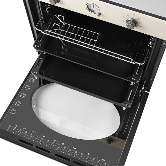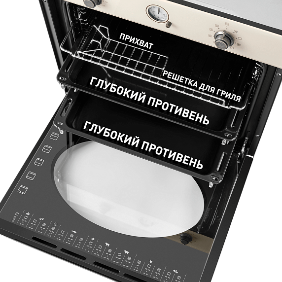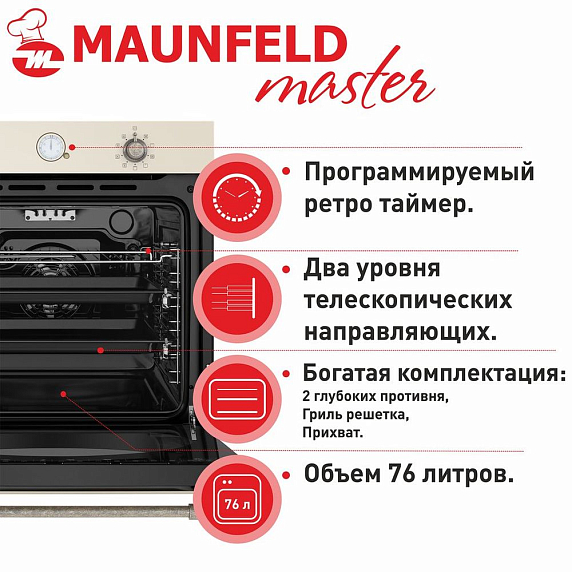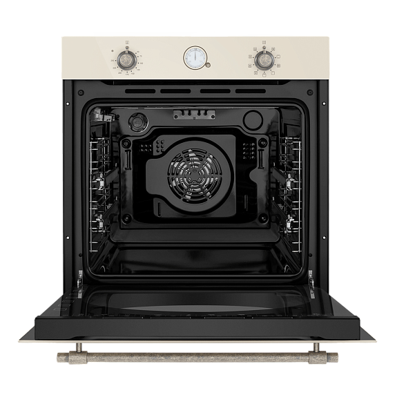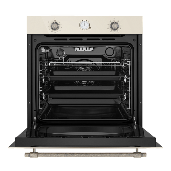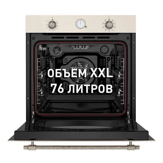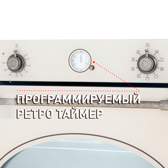Техника принадлежит к коллекции Ретро и имеет прекрасный бежевый цвет корпуса и бронзовую фурнитуру, что придаёт ей стильный и уникальный вид. Управление осуществляется с помощью механических поворотных переключателей, что делает его легким в использовании. В дополнение к этому, он оснащен аналоговым таймером и звуковым сигналом, которые помогут вам контролировать процесс приготовления.