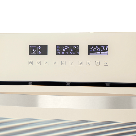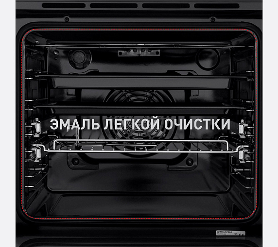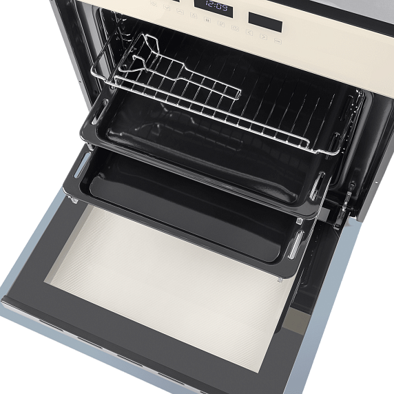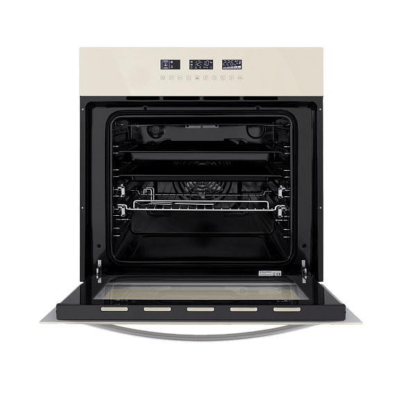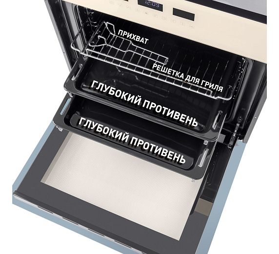 Объем рабочей камеры составляет 59 литров, что позволяет приготовить большое количество блюд одновременно. Внутренняя поверхность камеры покрыта эмалью легкой очистки, что облегчает уход за прибором. Съемная дверца и 5 уровней установки противней и решеток делают использование духового шкафа еще более удобным.