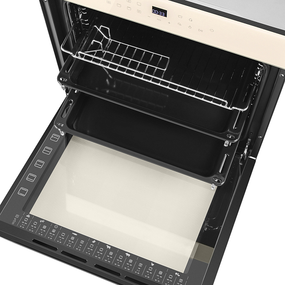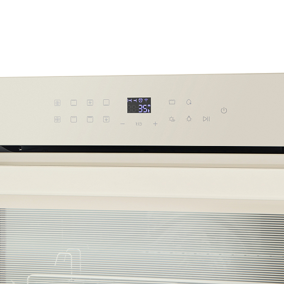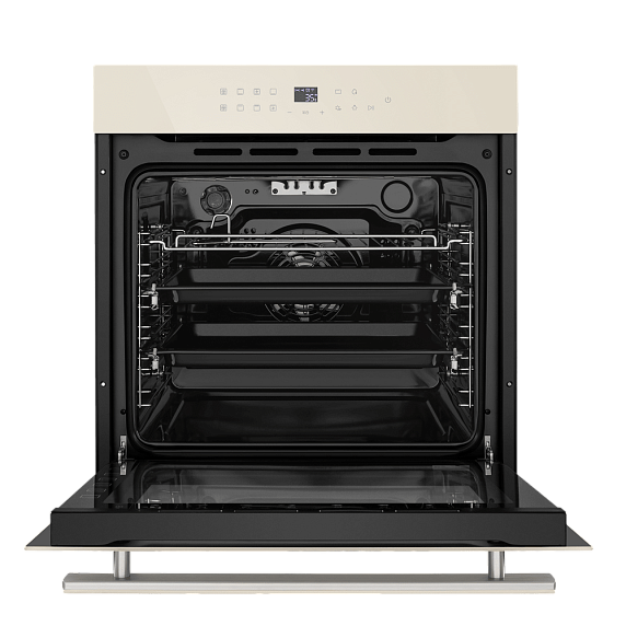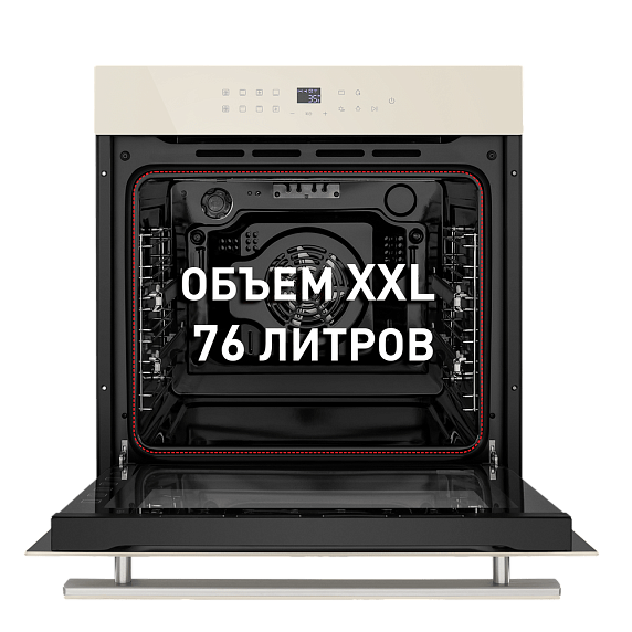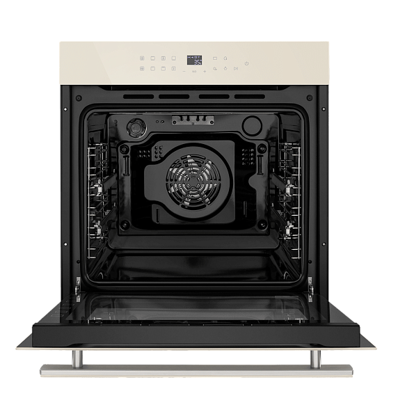 Встроенный вентилятор активно работает на протяжении всего процесса приготовления. Он создаёт особый воздушный барьер, который аккуратно выводит лишний жар наружу, не повреждая панель управления, мебель, рядом стоящую технику, а также не перегревая сильно поверхность духового шкафа. Кроме того, он помогает сохранить тепло внутри камеры.
