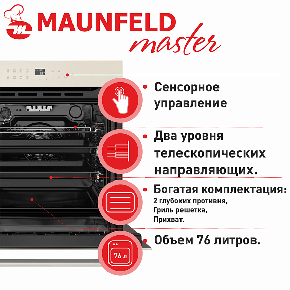 Дисплеи духовых шкафов Maunfeld не только наглядно показывают время суток, время отсрочки начала старта, символы активации того или иного режима и другую информацию, но и делают управление прибором максимально комфортным. Символьная и числовая информация на ярких цифровых дисплеях духовок Maunfeld четкая, легко читаемая, а выбор установок легко осуществляется с помощью сенсорных кнопок.