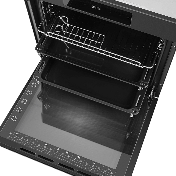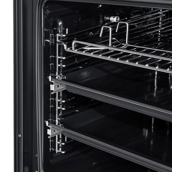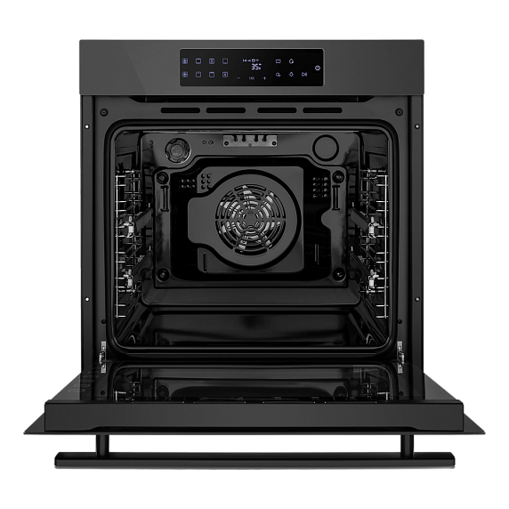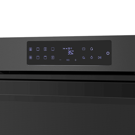Встроенный вентилятор активно работает на протяжении всего процесса приготовления. Он создаёт особый воздушный барьер, который аккуратно выводит лишний жар наружу, не повреждая панель управления, мебель, рядом стоящую технику, а также не перегревая сильно поверхность духового шкафа. Кроме того, он помогает сохранить тепло внутри камеры.