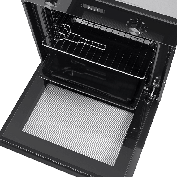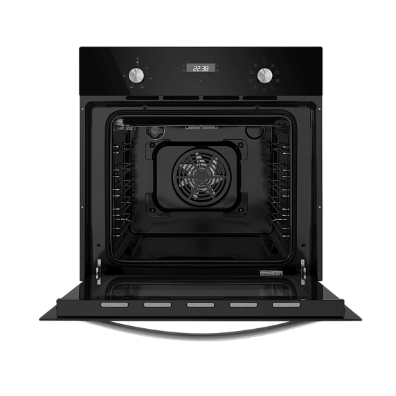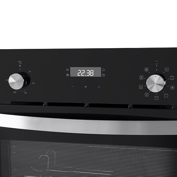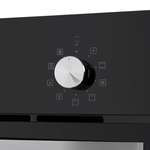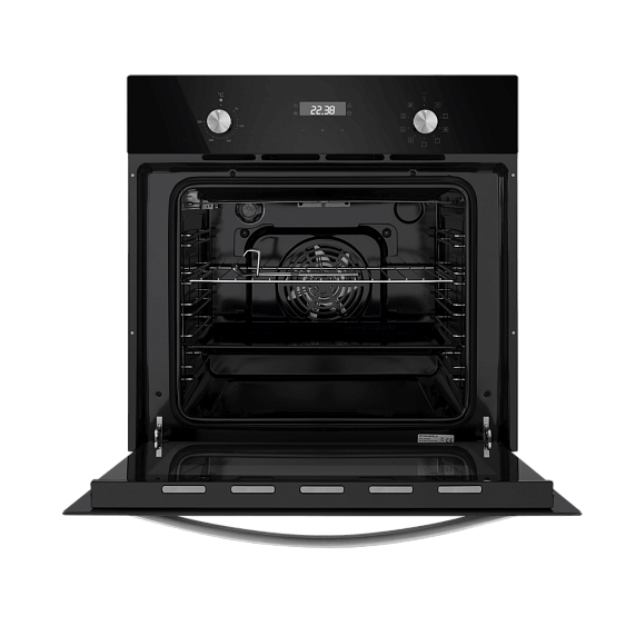 Встроенный вентилятор активно работает на протяжении всего процесса приготовления. Он создаёт особый воздушный барьер, который аккуратно выводит лишний жар наружу, не повреждая панель управления, мебель, рядом стоящую технику, а также не перегревая сильно поверхность духового шкафа. Кроме того, он помогает сохранить тепло внутри камеры.