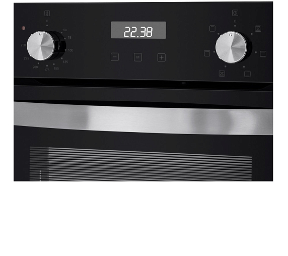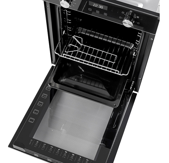 Электрическая духовка из серии «Модерн» гармонично соединяет изысканное оформление и инновационные технические решения. Тёмное исполнение корпуса в комбинации с металлической фурнитурой серебристого оттенка наделяет прибор утончённой современностью, идеально вписываясь в архитектуру актуального кухонного интерьера. Система управления реализована через электронную панель, дополненную сенсорным программатором и вращающимися регуляторами, что обеспечивает точность настроек и удобство взаимодействия.