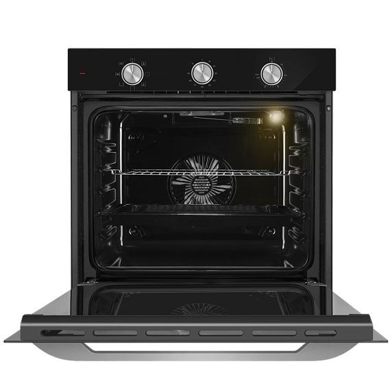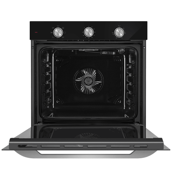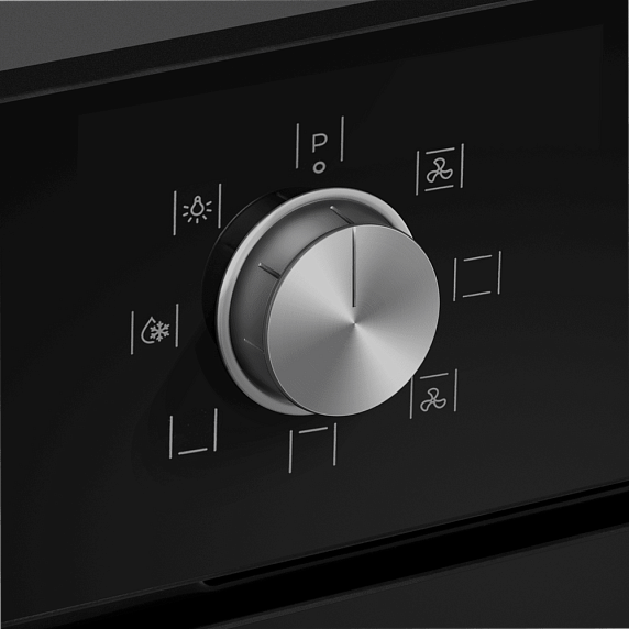 Встроенный вентилятор активно работает на протяжении всего процесса приготовления. Он создаёт особый воздушный барьер, который аккуратно выводит лишний жар наружу, не повреждая панель управления, мебель, рядом стоящую технику, а также не перегревая сильно поверхность духового шкафа. Кроме того, он помогает сохранить тепло внутри камеры.