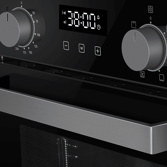Элегантный черный корпус с черной фурнитурой из нержавеющей стали создаёт современный и сдержанный образ, который легко вписывается в интерьер любой кухни. Компактная ширина 45 см делает прибор отличным выбором для небольших помещений, при этом рабочая камера объёмом 49 л обеспечивает достаточно места для приготовления семейных порций и запекания на стандартном противне. Дизайн сочетает минимализм и практичность: ровные линии фронтальной панели, цифровой дисплей аккуратно интегрирован в панель управления, часы и таймер позволяют планировать процесс приготовления и контролировать время без лишних действий.