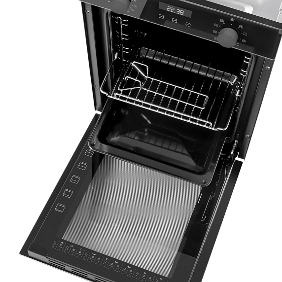 Внешне прибор выглядит сдержанно и современно: глянцево-чёрная фронтальная панель в сочетании с элементами из нержавеющей стали придаёт конструкции профессиональный и аккуратный вид. Прямоугольная форма корпуса при глубине 55 см и ширине 44.8 см рассчитана на компактную встраиваемую установку шириной 45 см, высота 59.5 см делает шкаф совместимым с большинством кухонных модулей. Дверца с двумя стеклами сохраняет температуру и выглядит компактно, а стальная фурнитура добавляет ощущение надёжности.