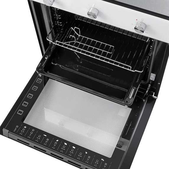 Устройство оборудовано четырьмя режимами приготовления, включая нижний газовый нагрев с вентилятором и традиционное приготовление, а также функцией гриля и гриля с конвекцией. Работа гриля возможна при закрытой дверце, что обеспечивает безопасность и комфорт при использовании. Электроподжиг обеспечивает быстрый и безопасный запуск газового нагрева. В комплекте с духовым шкафом идут стандартный противень, глубокий поддон и решетка, которые можно установить на пять различных уровней. Также предусмотрены телескопические направляющие на одном уровне. Внутреннее освещение обеспечивает хороший обзор приготовляемых блюд.