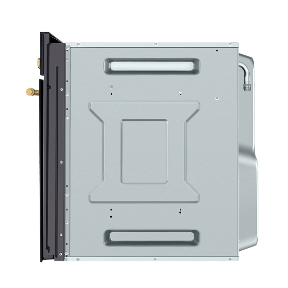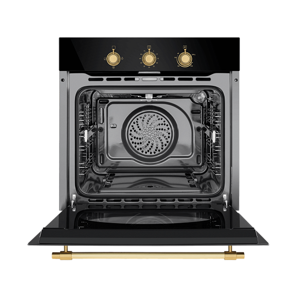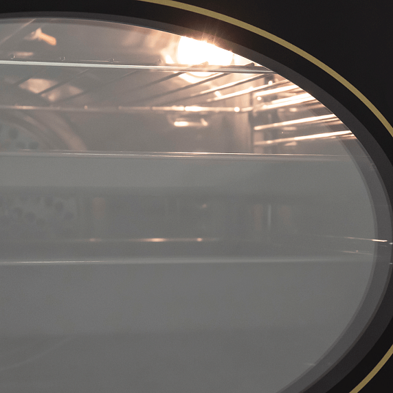 Встроенный вентилятор активно работает на протяжении всего процесса приготовления. Он создаёт особый воздушный барьер, который аккуратно выводит лишний жар наружу, не повреждая панель управления, мебель, рядом стоящую технику, а также не перегревая сильно поверхность духового шкафа. Кроме того, он помогает сохранить тепло внутри камеры.