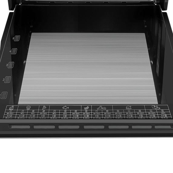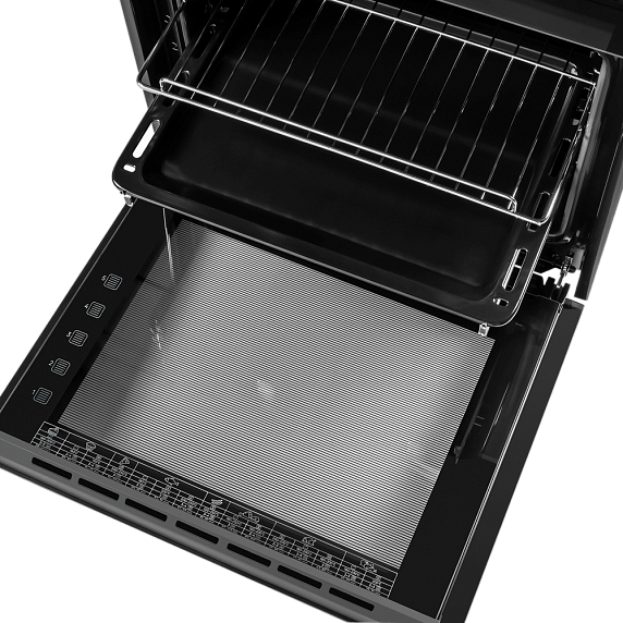 Внутри установлено три стекла на дверце, что обеспечивает отличную теплоизоляцию, предотвращая нагрев внешней поверхности и сохраняя тепло внутри. Освещение камеры помогает следить за процессом, не открывая дверцу — это удобно и способствует экономии энергии. Чистка осуществляется с помощью пара AquaClean: достаточно налить воду на дно, выбрать соответствующий режим, и пар размягчит загрязнения, которые легко удалить обычной губкой. Телескопические направляющие на одном уровне обеспечивают легкий и безопасный доступ к противню, позволяя вынимать блюда без риска обжечься. В комплекте предусмотрены стандартный противень и решетка для запекания различных продуктов.