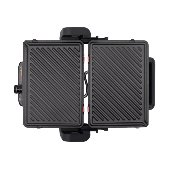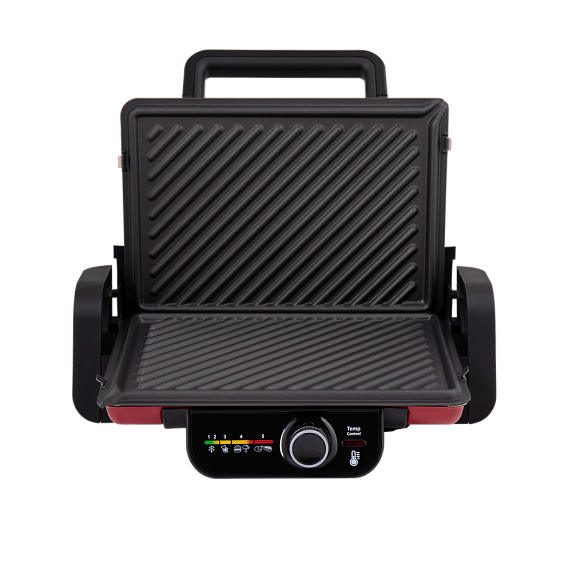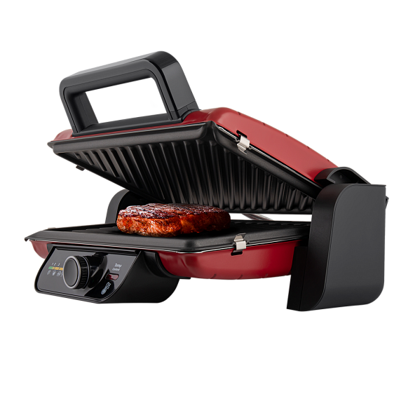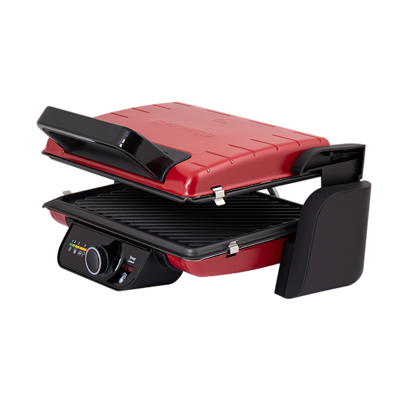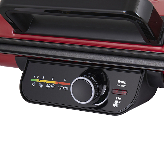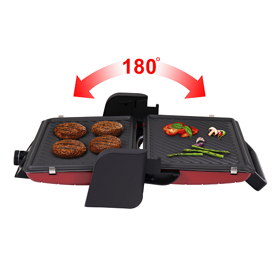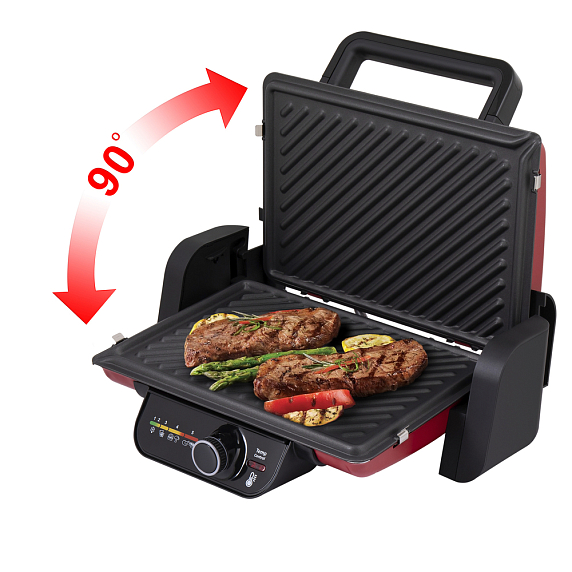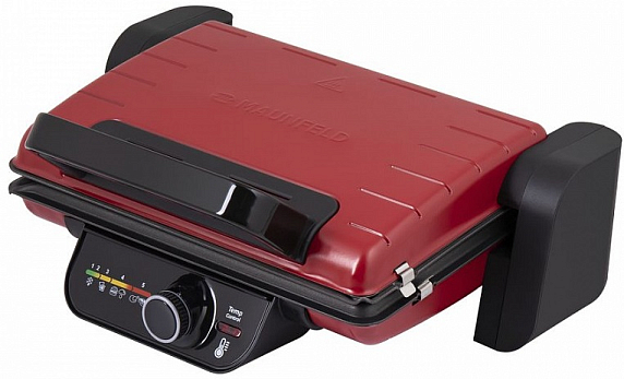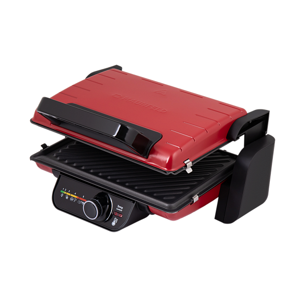 Гриль электрический MAUNFELD MGE2000CH красного цвета. Панели для жарки легко снять и помыть в посудомоечной машине. Крышка открывается на 180 градусов и получается большая поверхность для приготовления. Жир не будет брызгать в разные стороны, а стекать в специальный желоб.