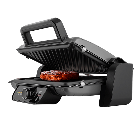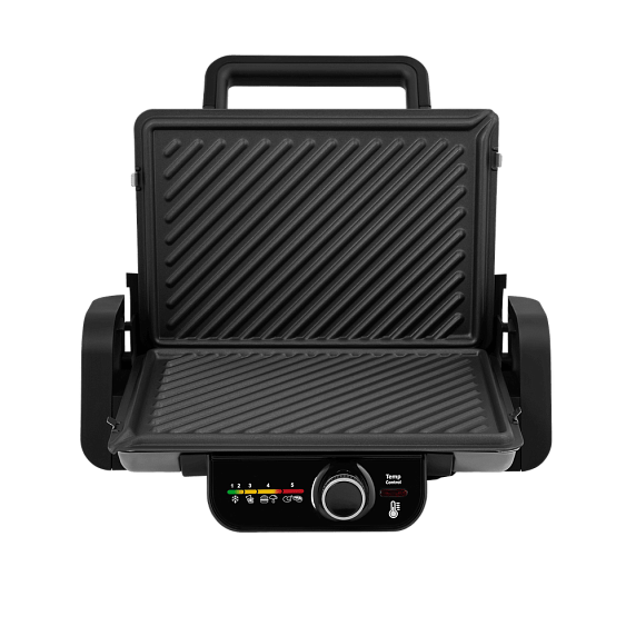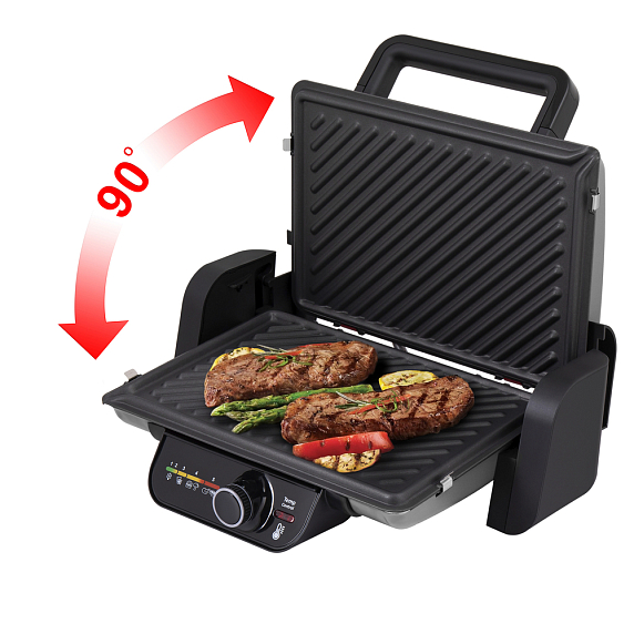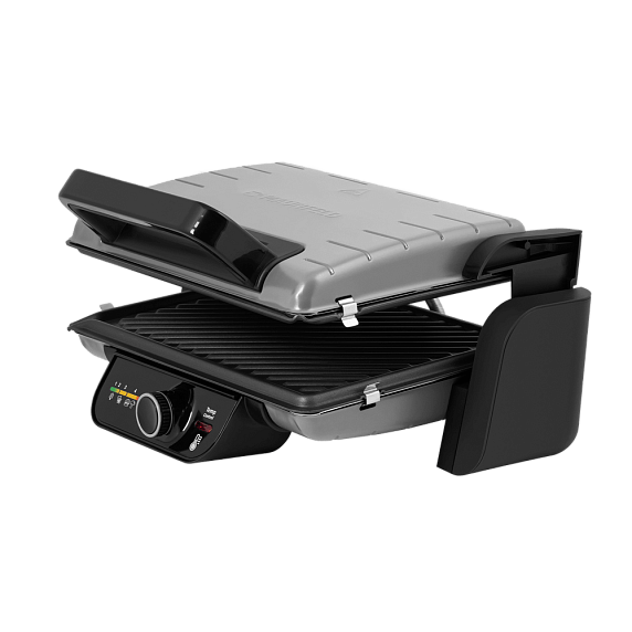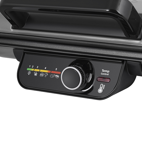 Электрогриль имеет механический тип управления, задавать необходимую температуру, нагрев, а также время обжаривания можно с помощью поворотной ручки. Выбранные параметры высвечиваются на дисплее. Встроенный дисплей устойчив к температурному воздействию, он характеризуется долгим сроком эксплуатации.