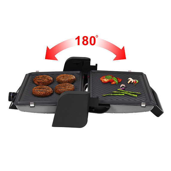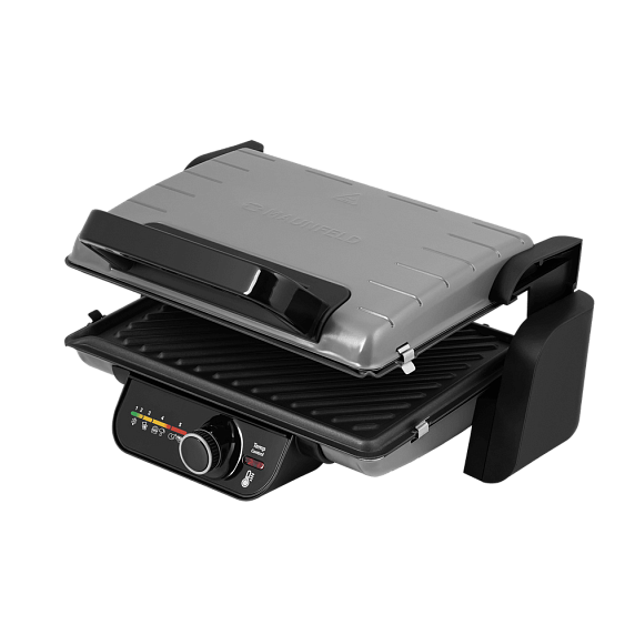 5 режимов нагрева позволят вам выбрать нужную температуру для прожарки мяса, рыбы или овощей. Крышка гриля Maunfeld MGE2000GR имеет возможность открываться на 180 градусов, и вы сможете использовать его в положении барбекю. В этом положении устройство превратится в большую жаровню, и задействует обе поверхности.