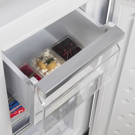 Холодильник Maunfeld MFF182NFW представлен в белом глянцевом цвете с элементами черного цвета. Наружная сенсорная панель позволяет устанавливать температуру и контролировать ее уровень, не открывая дверцу. Благодаря сенсорному дисплею вы можете в графическом и цифровом виде видеть информацию. Функция блокировки не позволяет детям отключать питание и менять настройки без надобности. Общий полезный объем техники составляет 418 л, из которых 274 л приходится на холодильную камеру, а 144 л — на морозильную. Холодильник Maunfeld MFF182NFW отлично подойдет для семьи из 3-4 человек. Морозилка предусматривает 6 ящиков и способна замораживать продукты до 8 кг. Функция холодильника «Суперзаморозка» позволяет понизить температуру в морозилке до минимума и удерживать ее на этом уровне в течение продолжительного времени. Благодаря этому помещенные внутрь продукты замораживаются быстро, эффективно и равномерно, а значит, лучше сохраняют свою структуру и содержащиеся в них полезные вещества и витамины.