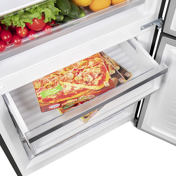 Морозильная секция оборудована автоматическим удалением инея, что заметно облегчает уход. Система охлаждения No Frost предотвращает возникновение наледи, гарантируя стабильную работу устройства и экономию времени на размораживание. Мощность замораживания составляет 5 кг за сутки, что даёт возможность оперативно и качественно замораживать продукты. Морозильное отделение включает три ящика, обеспечивая удобную систематизацию пространства. Также присутствует форма для льда, делающая холодильник более многофункциональным и комфортным для повседневного применения.