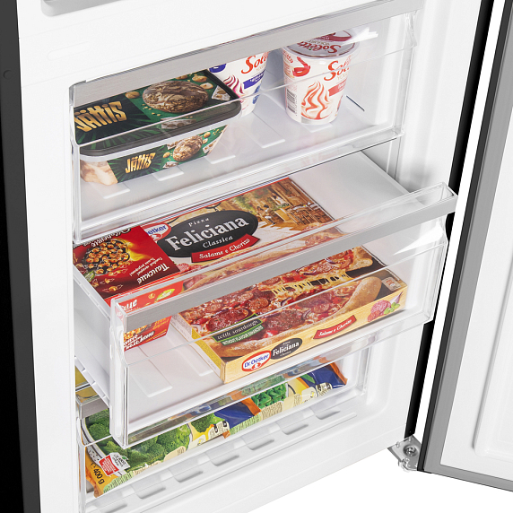 Данный холодильник оборудован инверторным компрессором, который работает тихо и эффективно, поддерживая постоянную температуру в камерах. Благодаря этому продукты дольше сохраняют свежесть и полезные качества. Будь то свежие овощи или замороженные полуфабрикаты, Maunfeld MFF185NFB Inverter превосходно справится с их хранением.