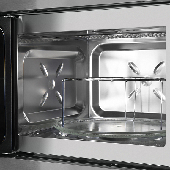 Блокировка от детей реализована корректно и не мешает обычному использованию. В комплекте есть стеклянная поворотная тарелка диаметром 27 см, решётка для гриля и полный набор для встраивания, что избавляет от необходимости что-то докупать отдельно. Поворотный стол распределяет микроволны равномерно, и это заметно по результату нагрева.