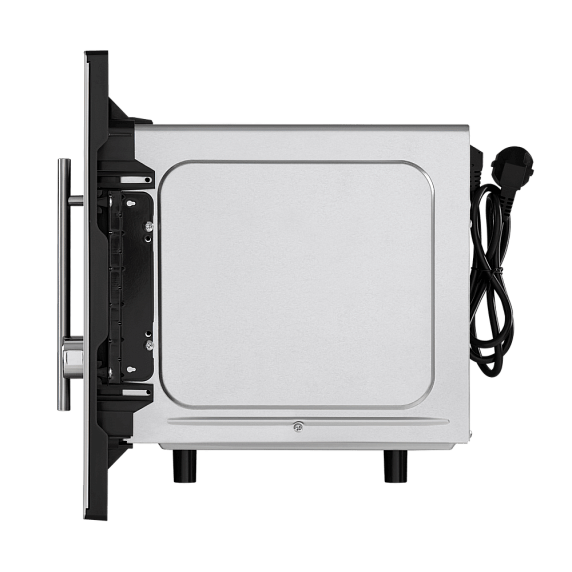 Корпус выполнен в нержавеющей стали и визуально хорошо вписывается в современные кухни. Ничего кричащего, всё строго и собранно. Дверца навесная, открывается с помощью ручки, и это решение показалось мне более надёжным, чем кнопочные механизмы. Рабочая камера тоже из нержавеющей стали, что упрощает уход: брызги и следы еды удаляются без долгих усилий. Объём 20 литров выглядит скромно на бумаге, но в реальности в камеру спокойно помещается стандартная посуда и даже форма для запекания небольших размеров.