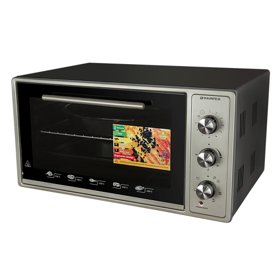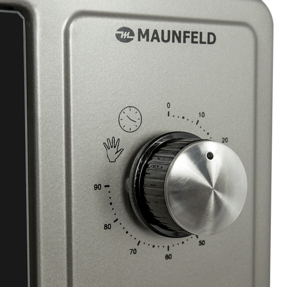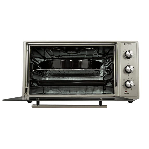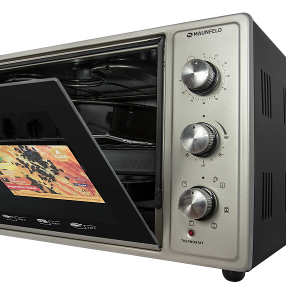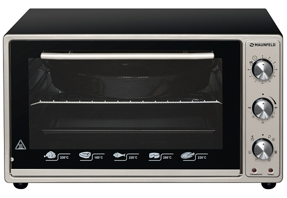 Механическая панель управления удобна в эксплуатации, нужно просто повернуть поворотный переключатель, который вращается плавно, до необходимого значка рядом. Комплектация предусматривает наличие решетки для гриля, прямоугольного противня, круглого противня. С помощью таких приспособлений вы сможете готовить блюда из мяса, птицы, рыбы и овощей. В печах Маунфилд выпечка получается хрустящей снаружи и мягкой внутри.