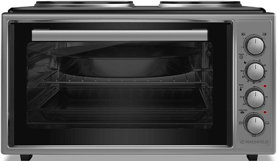 Мини-печь MAUNFELD MMO-483MGR01H обладает 2 конфорками расположенными сверху устройства. Управление осуществляется с помощью поворотных регуляторов, все режимы у вас не виду. Специальный вентилятор распределяет горячий воздух по всей внутренней камере, за счет этого происходит равномерное пропекание.