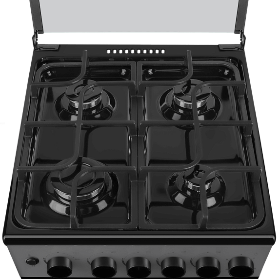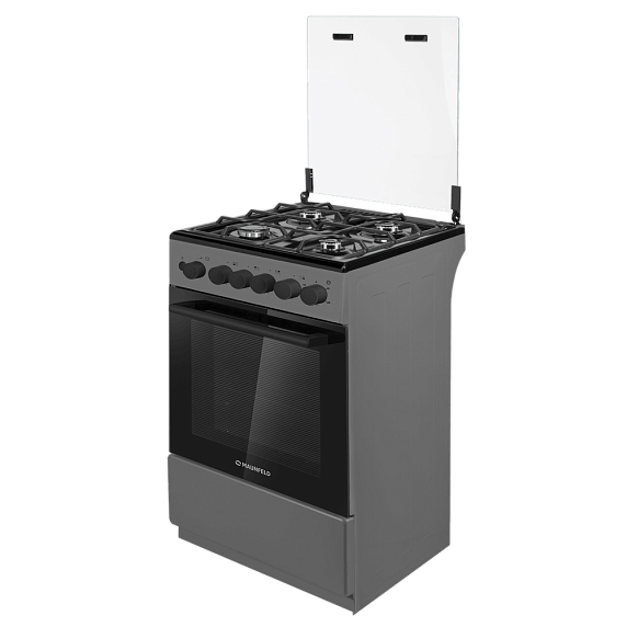 Газовая плита серого цвета с эмалированным металлическим корпусом и черным фасадным стеклом привлекает внимание своим стильным дизайном. Механическая панель управления с поворотными переключателями обеспечивает простоту и надежность в использовании. Наличие таймера позволяет точно контролировать процесс приготовления пищи, что особенно удобно для занятых пользователей. Эта модель сочетает в себе элегантность и функциональность, создавая комфортные условия для приготовления разнообразных блюд.