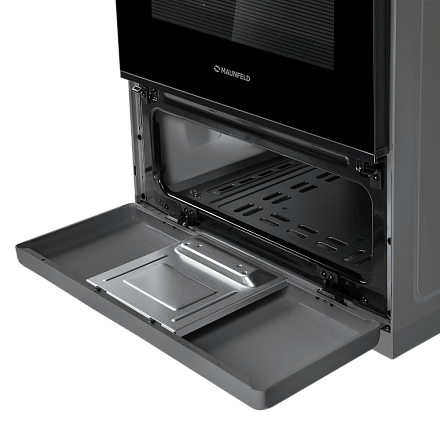 Внутренняя камера духовки имеет объем 59 литров и оснащена системой гидролизной очистки, значительно упрощающей уход за поверхностью. Покрытие выполнено из специальной черной эмали, которая устойчива к загрязнениям и легко очищается. Класс энергоэффективности устройства — A, что говорит о его экономичном потреблении ресурсов. Дополнительными преимуществами модели являются вместительный выдвижной ящик для посуды, наличие противня и решетки для гриля, которые обеспечивают комфортную эксплуатацию и расширяют функциональные возможности плиты.