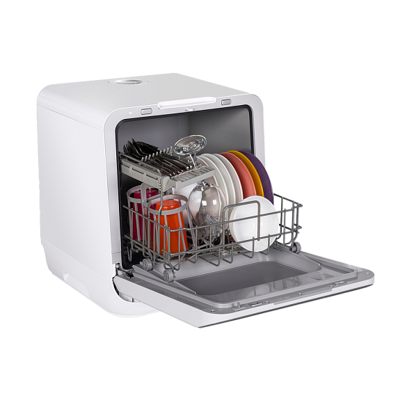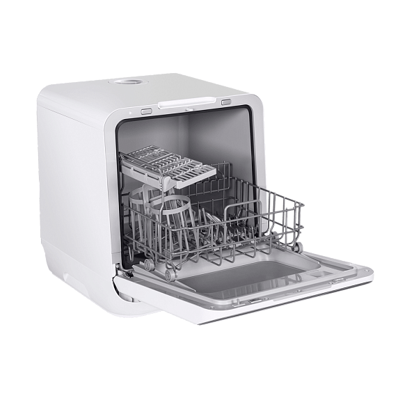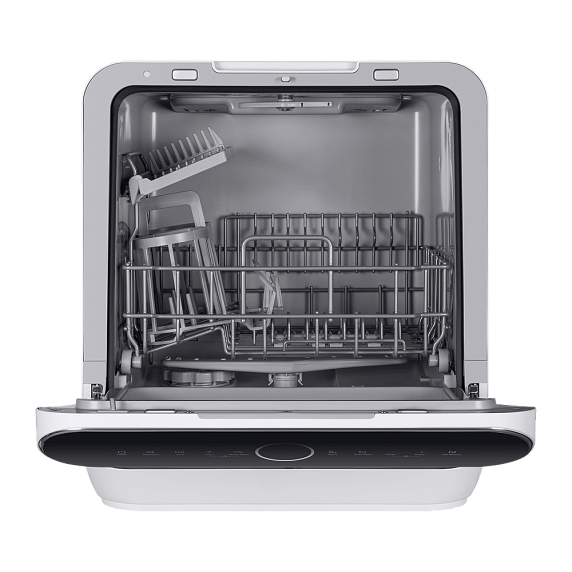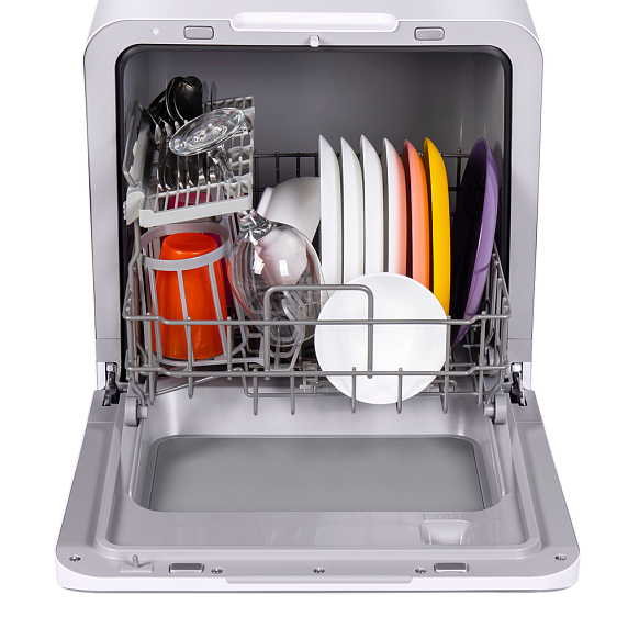 Компактными называют посудомоечные машины, которые выпускаются высотой около 45 см. Они могут быть узкими (шириной 45 см) и широкими (шириной 55 см). При этом их можно устанавливать на столешницу или на специальную полку / тумбу. Главное условие — доступ к водопроводу и канализации. У таких моделей только 1 корзина для мытья и вместимость от 3 до 6 комплектов.