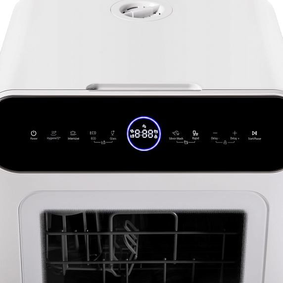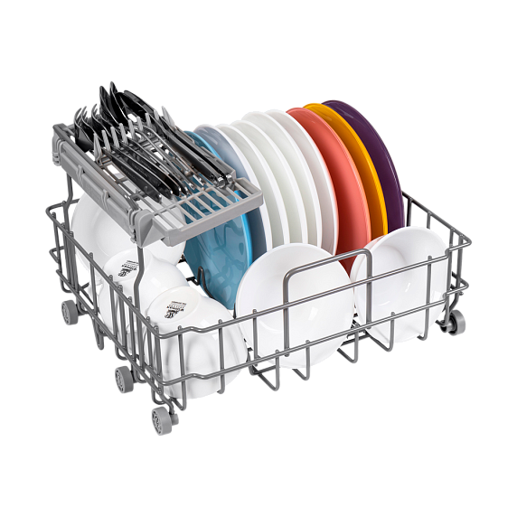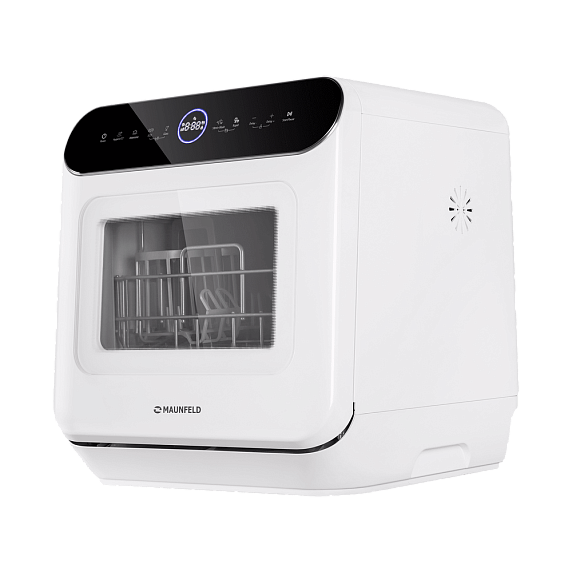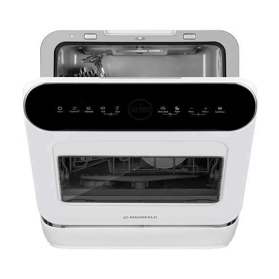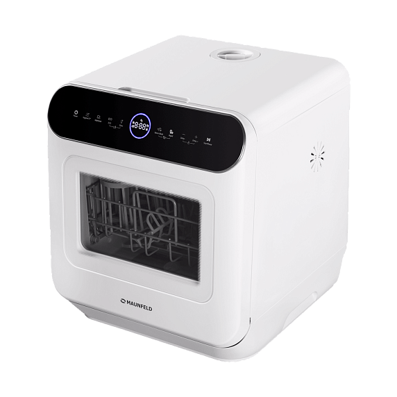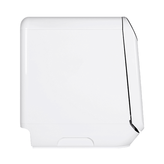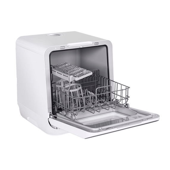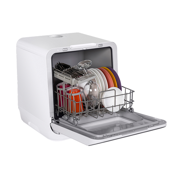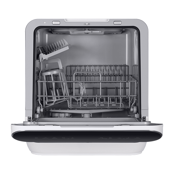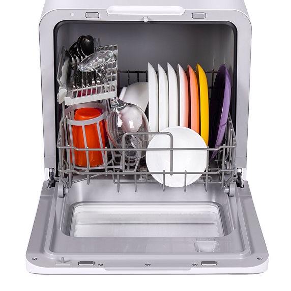 Компактные размеры машины не влияют на ее вместительность — внутри помещается три комплекта посуды. И это при том, что машина занимает минимум места на кухне.