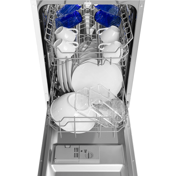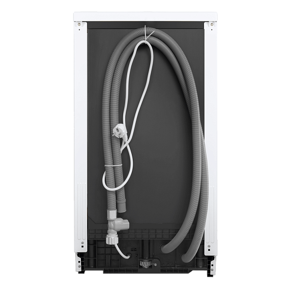 Белый цвет корпуса и черная панель управления с кнопками и дисплеем создают элегантный и современный образ, который будет гармонировать с любым интерьером. Машина способна одновременно помыть до 10 комплектов посуды, что делает ее идеальным выбором для больших семей или любителей приглашать гостей.