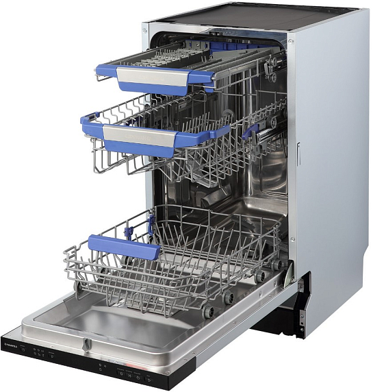 Внутреннее устройство оборудовано тремя корзинами для посуды, включая выдвижной лоток для столовых приборов, что обеспечивает удобное размещение различной посуды и оптимальное использование пространства. Возможность регулировки высоты ножек позволяет точно подстроить положение машины, обеспечивая надежную и устойчивую установку. Комплектация включает заливной и сливной шланги, что облегчает подключение и эксплуатацию сразу после покупки.