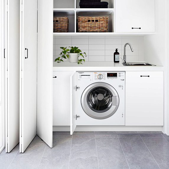 Устройство оснащено электронной системой управления в виде дисплея с кнопками и поворотным переключателем. В качестве меры безопасности панель управления блокируется от детского вмешательства. Главная особенность — использование сушки. Вы можете с помощью данной модели сэкономить свое время и высушить постиранное за 4.5 часа. Прибор отлично подойдет для семьи из 3-4 человек. Количество режимов для разных типов белья — 16. Например, стандартная программа для хлопка, деликатный режим, если одежду нельзя подвергать высоким температурам, а также экспресс-программа для быстрой работы.