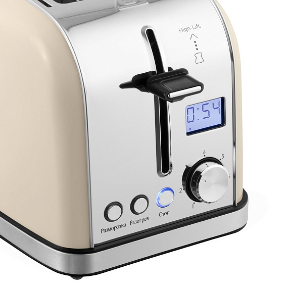 Тостер Maunfeld MF-821BG выполнен в бежевом цвете. Корпус прибора сделан из нержавеющей стали. Модель оснащена 3 функциями: подогрев, поджаривание и разморозка.