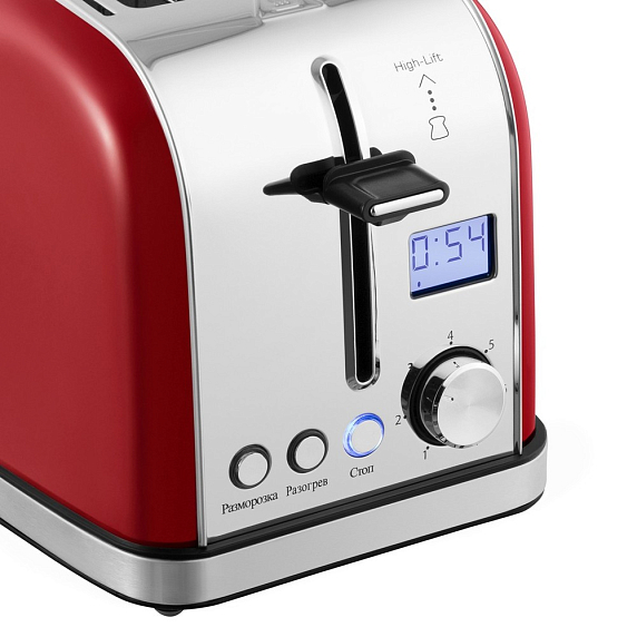 Тостер Maunfeld MF-821CH выполнен в красном цвете. Корпус прибора сделан из нержавеющей стали. Модель работает в 3 режимах: подогрев, поджаривание и разморозка. Прибор оснащен дисплеем, что выгодно отличает его от других моделей данной категории.