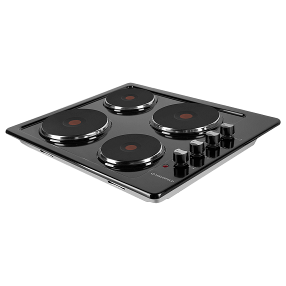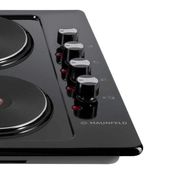Электрическая варочная панель Maunfeld EEHE.64.4B относится к коллекции «Light» и выполнена в черном цвете. Для управления прибора на боковой стороне расположены высокопрочные термостойкие пластиковые ручки серебристого цвета. У модели 4 чугунные конфорки быстрого и среднего нагрева HP RAPID.