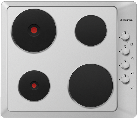 Maunfeld MEHS.64.85S — это электрическая варочная панель из нержавеющей стали. Модель оснащена четырьмя чугунными конфорками, из которых две — быстрого нагрева и две — среднего. Управление механическое, поворотные ручки размещены на боковой панели с правой стороны.
