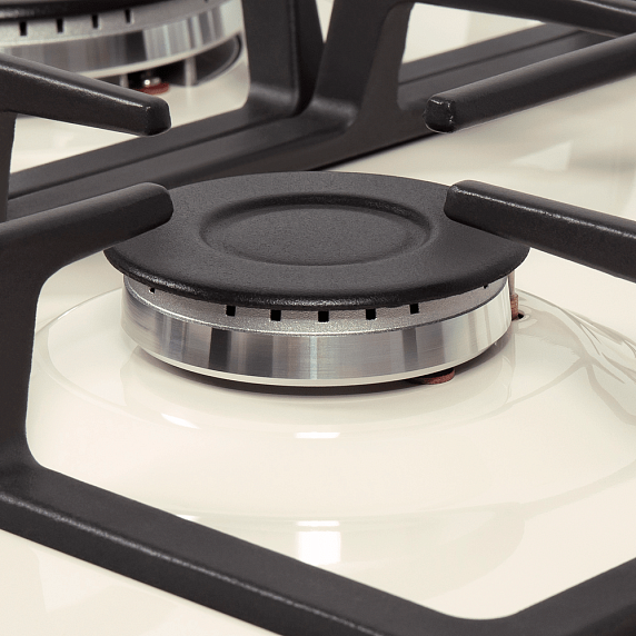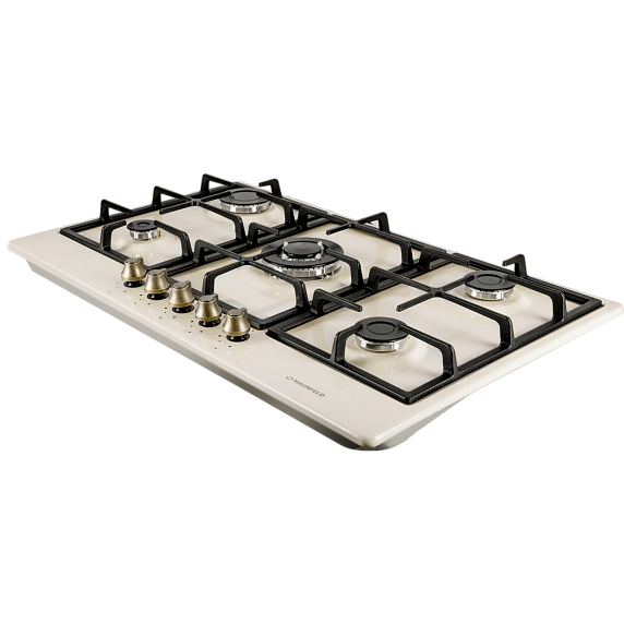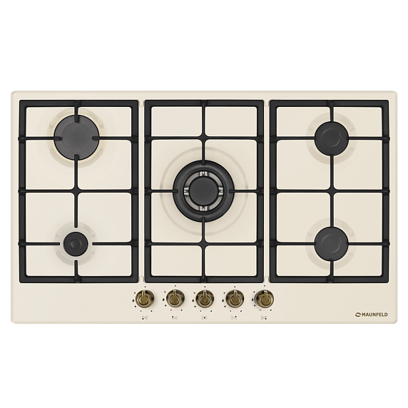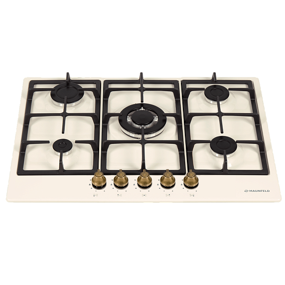 Газовая варочная панель Maunfeld EGHE.95.33CBG.R/G из серии Light выполнена в цвете «слоновая кость». Прибор имеет 5 конфорок различной мощности: от экономичной в 1000 Вт до сверхбыстрой WOK в 3800 Вт. Поверхностью удобно управлять с помощью поворотных цельнометаллических ручек в бронзовом цвете. Автоматический электроподжиг расположен в ручке конфорки.