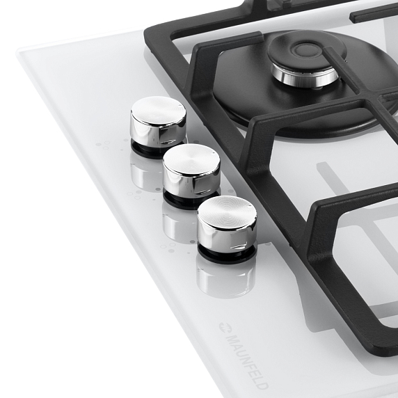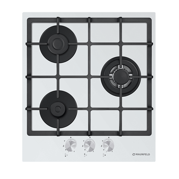 Maunfeld EGHG.43.33CW/G — это газовая варочная панель на три конфорки шириной 45 см. Есть мощная WOK-горелка. Элементы управления — металлические поворотные переключатели. Решётки чугунные, с упругой прокладкой, которая защищает поверхность от царапин. Безопасность обеспечивает функция «газ-контроль». Модель может работать на магистральном газе либо подключаться к баллону.