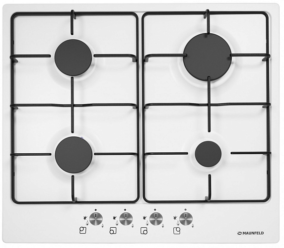 Maunfeld MGHE.64.62W — это газовая варочная панель, имеющая классический дизайн. На белой эмалированной поверхности симметрично расположены четыре конфорки. Решётки выполнены из эмалированного металла чёрного цвета. На передней панели установлены хромированные поворотные ручки из пластика. Модель оснащена газ-контролем и электроподжигом. Подходит для подключения как к магистральному газопроводу, так и к баллону.