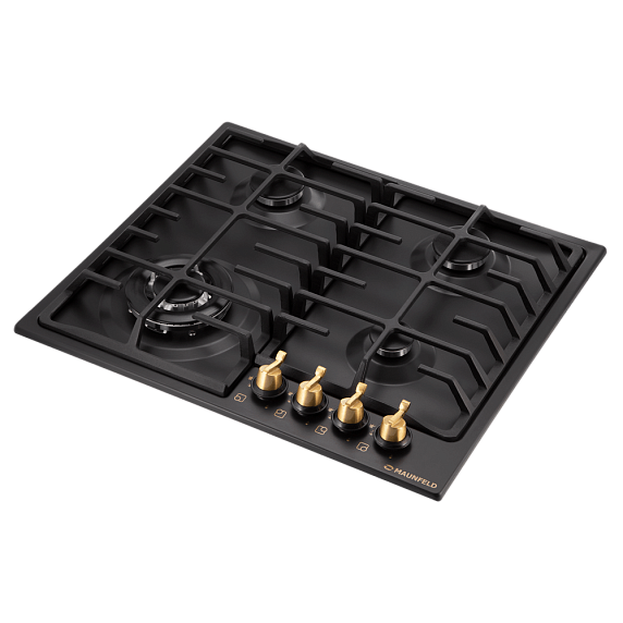 Maunfeld MGHE.64.74RIG — это прямоугольная газовая варочная панель чёрного цвета. Модель выполнена в стиле «Ретро», имеет фурнитуру золотого цвета. Одна из четырёх конфорок — мощная WOK с тройным кольцом пламени. Решётки чугунные. Элементы управления — поворотные цельнометаллические ручки золотого цвета, установленные с правой стороны на передней панели. Есть электроподжиг и газ-контроль.