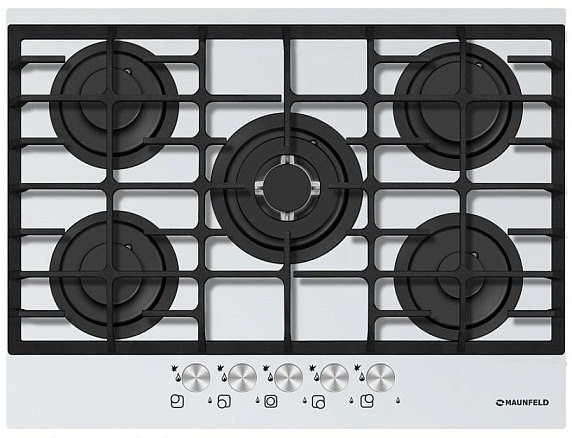 Maunfeld MGHG.75.13W — это газовая варочная панель из высокопрочного закаленного стекла белого цвета. Имеет пять конфорок (одна из которых — WOK с тройным кольцом пламени). Укомплектована чугунными решётками. Для данной модели предусмотрены чугунные решётки с прокладками, помогающими избежать царапин на поверхности. Управление осуществляется поворотными цельнометаллическими переключателями серебристого цвета. Оснащена электроподжигом и газ-контролем. Комплектуется жиклёрами для баллонного газа.