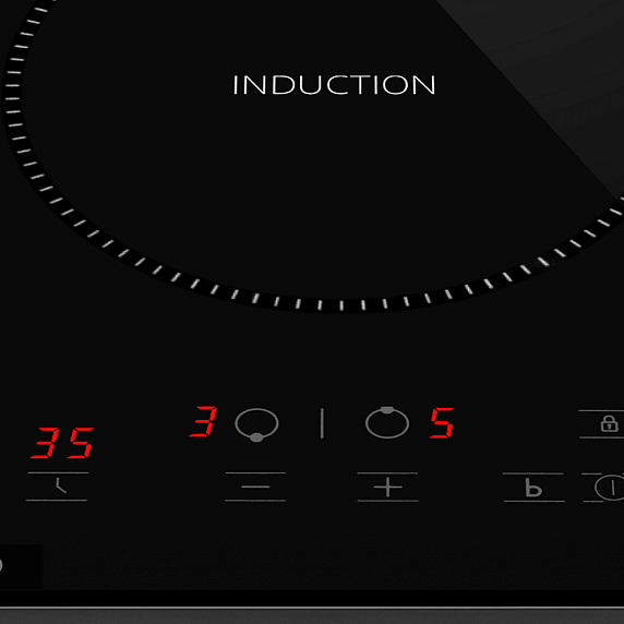 - Две индукционные зоны с усилением мощности дают быстрый разогрев и сокращают время приготовления блюд.