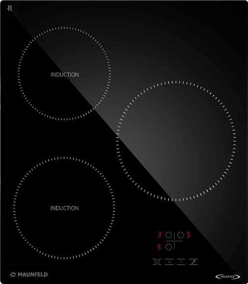 - Три индукционные конфорки с усилением мощности обеспечивают быстрое приготовление пищи.