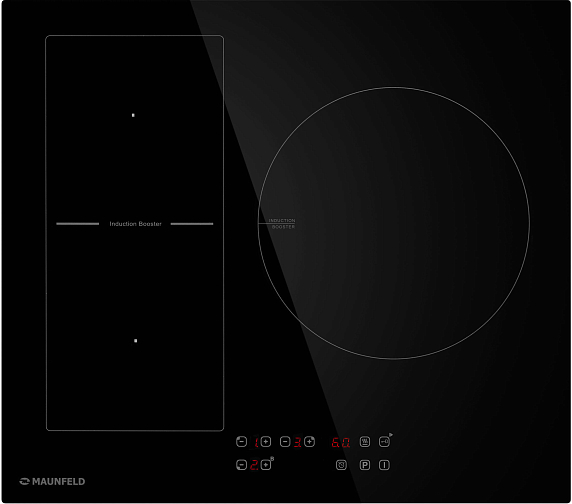 Индукционная варочная панель Maunfeld CVI593BK2 имеет 6500 Вт, это означает, что вы можете готовить на 3 конфорках одновременно без потери мощности. Индикатор наличия посуды показывает есть посуда или она не подходит для использования на данном устройстве. Зоны индукционной варочной поверхности подстраиваются под размеры посуды.
