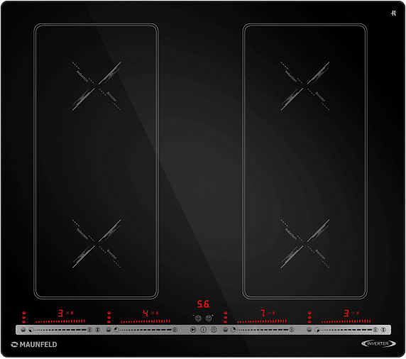 На панели предусмотрена индикация ступени нагрева, индикатор наличия посуды и функция вывода сообщения об ошибке. Также панель оснащена технологией непрерывного нагрева, функцией размораживания и функцией Bridge. Эта последняя позволяет объединить две конфорки в одну большую зону нагрева. Функция Booster (усиление мощности) позволяет быстро нагреть панель до максимальной температуры. Индукционная варочная панель Maunfeld CVI594SB2BKA Inverter оснащена таймером с функцией установки времени для каждой зоны отдельно. Функция паузы Stop & Go позволяет приостановить процесс приготовления и затем продолжить его без потери настроек. Благодаря инверторной технологии, панель работает более эффективно и экономично.