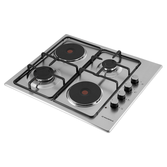 Maunfeld EEHS.64.5ES/KG — это комбинированная варочная поверхность с четырьмя конфорками, две из которых газовые и две — электрические. Элементы управления — поворотные ручки, расположенные с правой стороны. Материал поверхности — нержавеющая сталь, решётки эмалированные. Модель может работать на разных типах газа. Функция газ-контроля обеспечивает безопасную эксплуатацию.