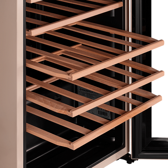 Освещение камеры выполнено на основе светодиодной технологии, что обеспечивает яркое и одновременно мягкое освещение, не нагревающее вино. Шкаф оснащен одним стандартным компрессором, который обеспечивает надежную и стабильную работу устройства. Полки из бука не только удобны для использования, но и придают дополнительную эстетику.