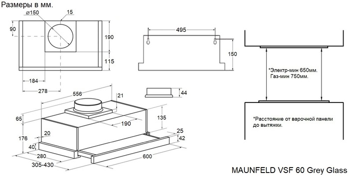 Схема встраивания для кухонной вытяжки Maunfeld VSF 60 Grey Glass White